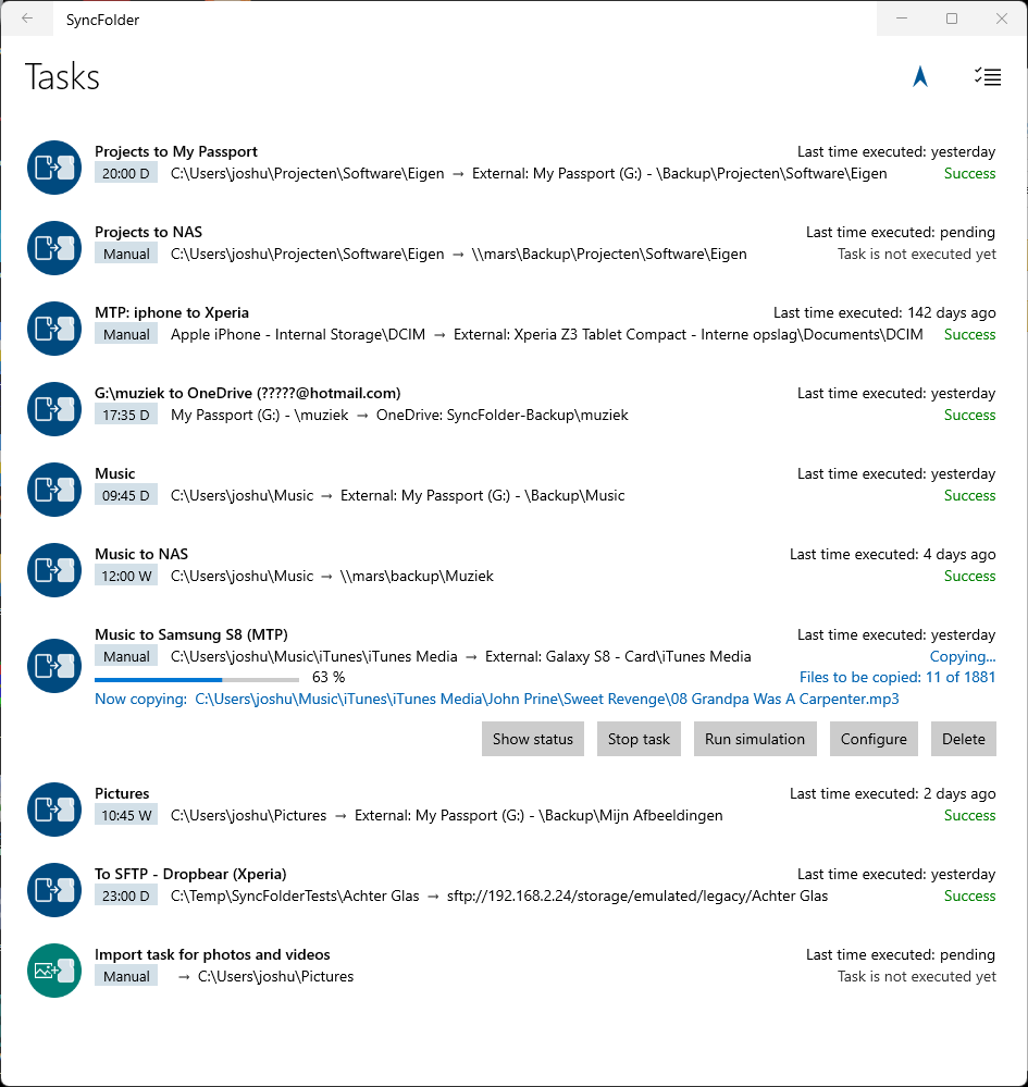 With this app it is easy to make backup copies of your important files and folders. SyncFolder ensures that all changes in selected folders are synchronized on internal storage (local drives), external storage (USB flash drives, hard drives, etc.), network storage (NAS, etc.), cloud storage, or SFTP/FTP servers. Pictures and videos on your camera, smartphone or tablet can be imported via USB or WiFi.