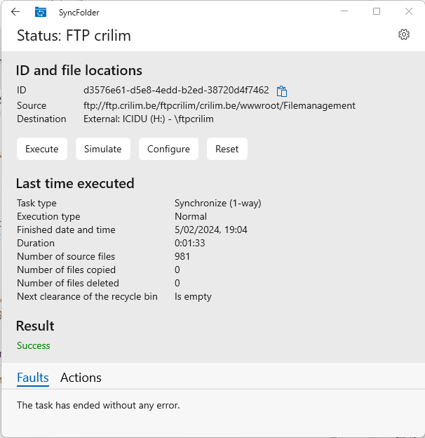 The status page gives a summary of what went on during the last execution: the result (success or not), how long the process took to finish,
